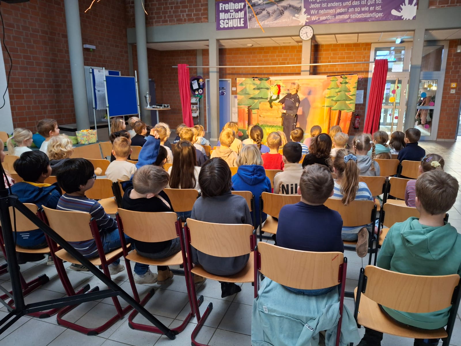 Die Verkehrspuppenbühne der Kreispolizeibehörde Kleve war am 25.02. und 26.02.2026 an unserer Schule zu Gast und führte für die Kinder der ersten Klassen eine verkehrspräventive Veranstaltung durch. Begleitend nahmen auch viele Erziehungsberechtigten an einer Informationsveranstaltung teil.